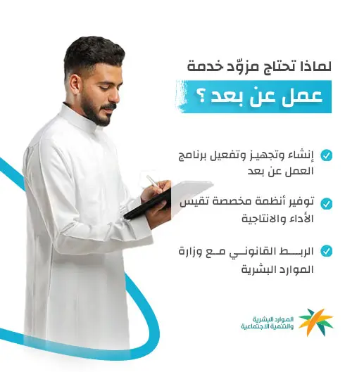 يعد برنامج العمل عن بعد بمثابة جهة قانونية رئيسية تضم تحت مظلتها العديد من مزودي الخدمات الذين تم اعتمادهم رسمياً من قبل وزارة الموارد البشرية والتنمية الاجتماعية بشكل يضمن لكل من -الشركات المنضمة إلى البرنامج و الباحثين عن عمل الذين يتم توظيفهم من خلال البرنامج- كامل حقوقهم و ومزاياهم.